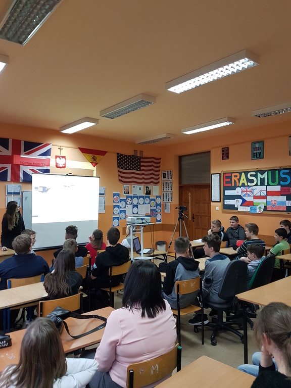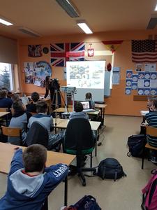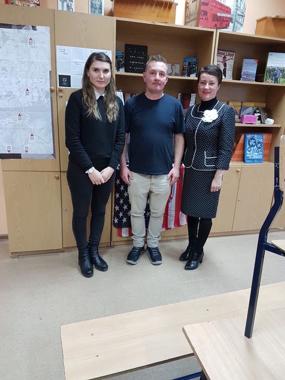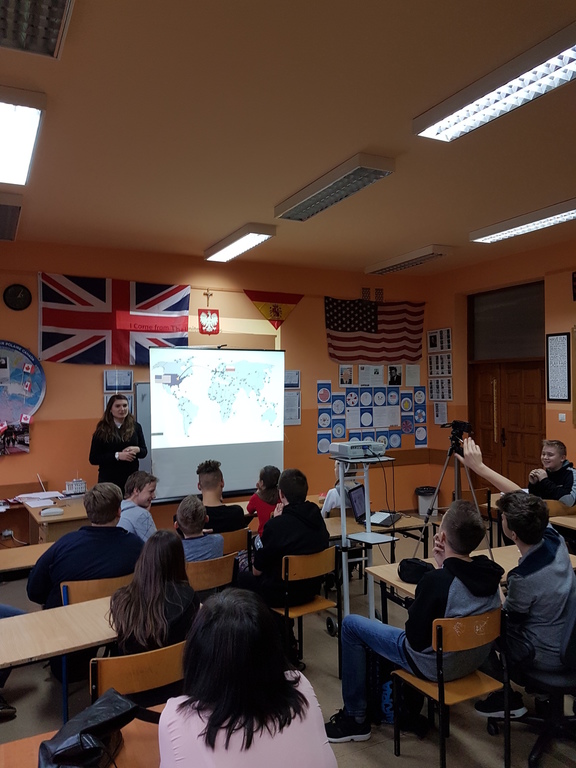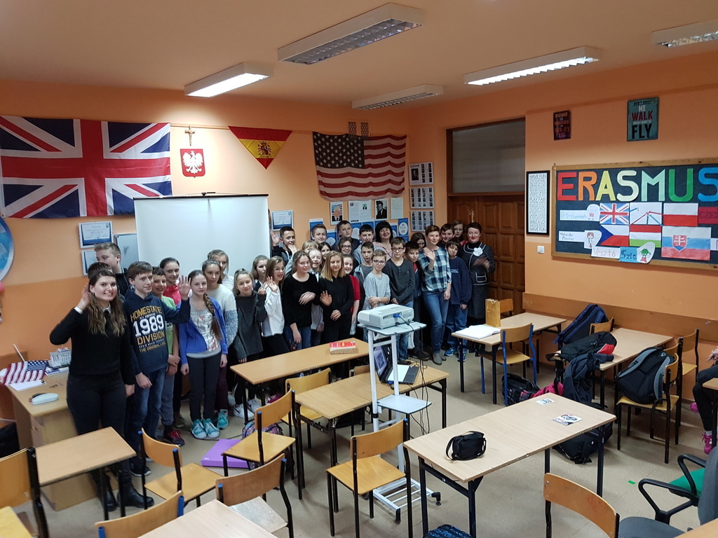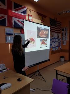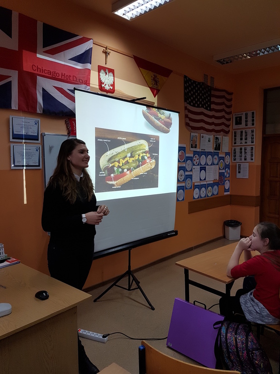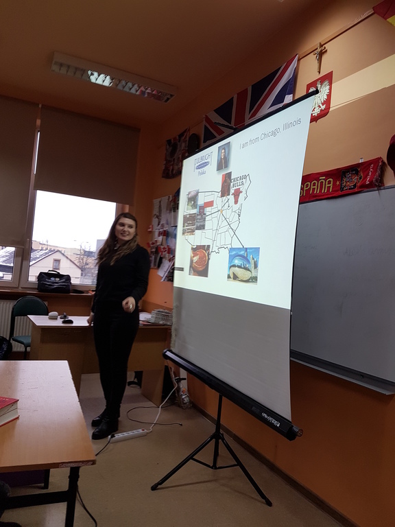 Pani Carol jest absolwentką uniwersytetu w Illinois i rodowitą Amerykanką, a więc interesująco przedstawiła uczniom kilka ciekawostek kulturowych dotyczących USA. Wśród wielu zagadnień zostały omówione zwyczaje żywieniowe, typowe święta amerykańskie, sposoby spędzania czasu wolnego przez dzieci i młodzież oraz wielkie miasta Ameryki.