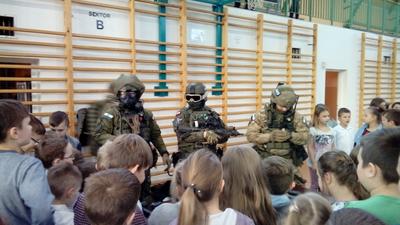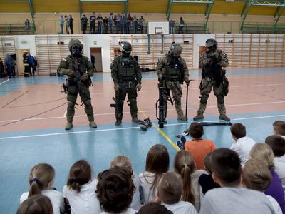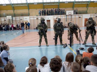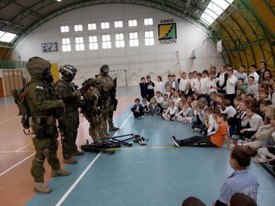 Gościliśmy także miłośników wojska z grupy B3- Be Free Łódź, w skład której wchodzi były uczeń naszej szkoły i zawodowy żołnierz z Jeleniej Góry- Zbyszek Miara. Służby mundurowe zaprezentowały uczniom sprzęt, z którego korzystają podczas akcji ratunkowych i dywersyjnych. Chętni uczniowie mieli pomalowane twarze i wyglądali tak, jak prawdziwi komandosi, mieli również możliwość sprawdzenia swoich umiejętności fizycznych w przeciąganiu liny czy pompowaniu materaca strażackiego.