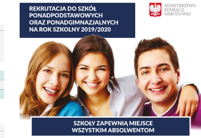 Materiały informacyjne dotyczące rekrutacji do szkół ponadpodstawowych na rok szkolny 2019/2020: https://www.gov.pl/web/edukacja/rekrutacja-na-rok-szkolny-20192020
