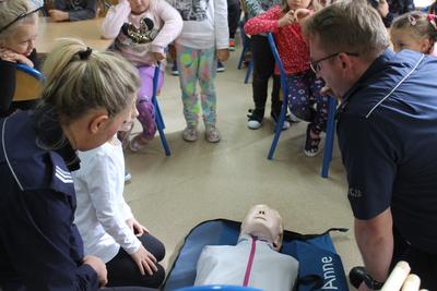 Uczniowie uczestniczyli również w pokazie udzielania pierwszej pomocy w nagłych przypadkach - ćwiczenia na fantomie.