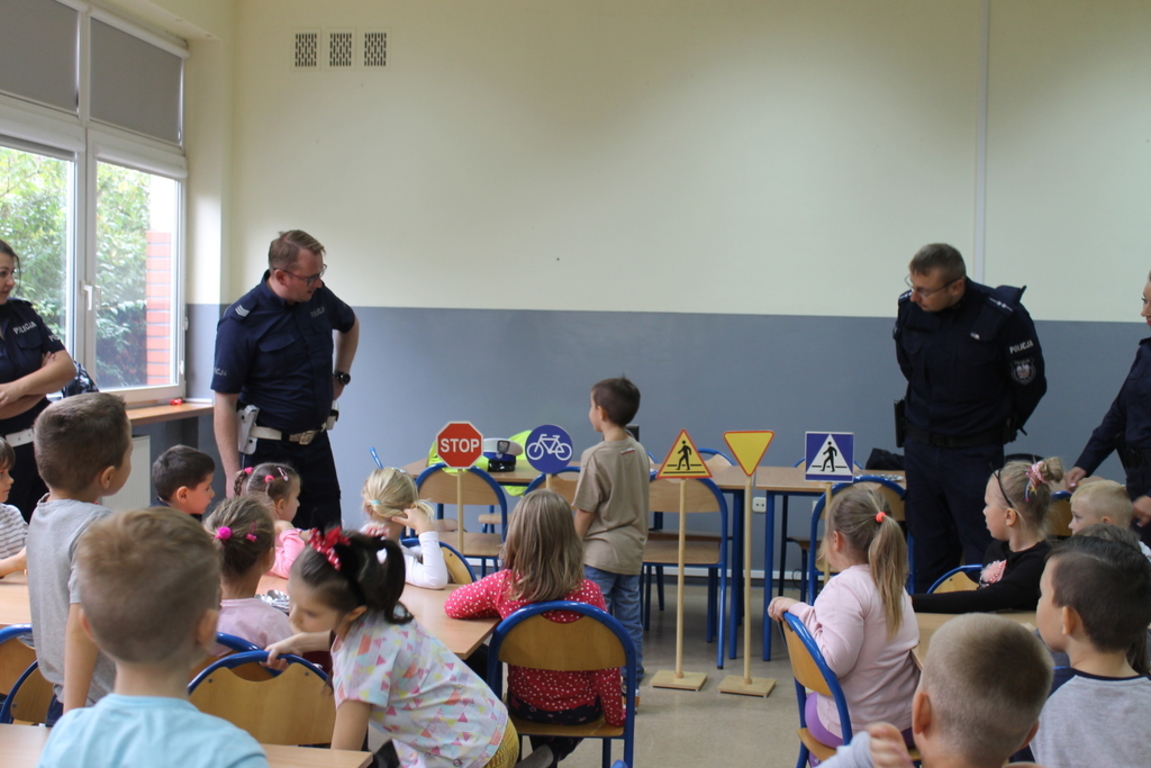 Przeprowadzili zajęcia teoretyczno - praktyczne dla dzieci. Przybliżyli zadania, jakie najczęściej wykonują policjanci podczas służby, a także omówili zagadnienia związane z ruchem drogowym, w tym elementarne zasady bezpieczeństwa obowiązujące w ruchu drogowym w obszarze zabudowanym i poza nim.
