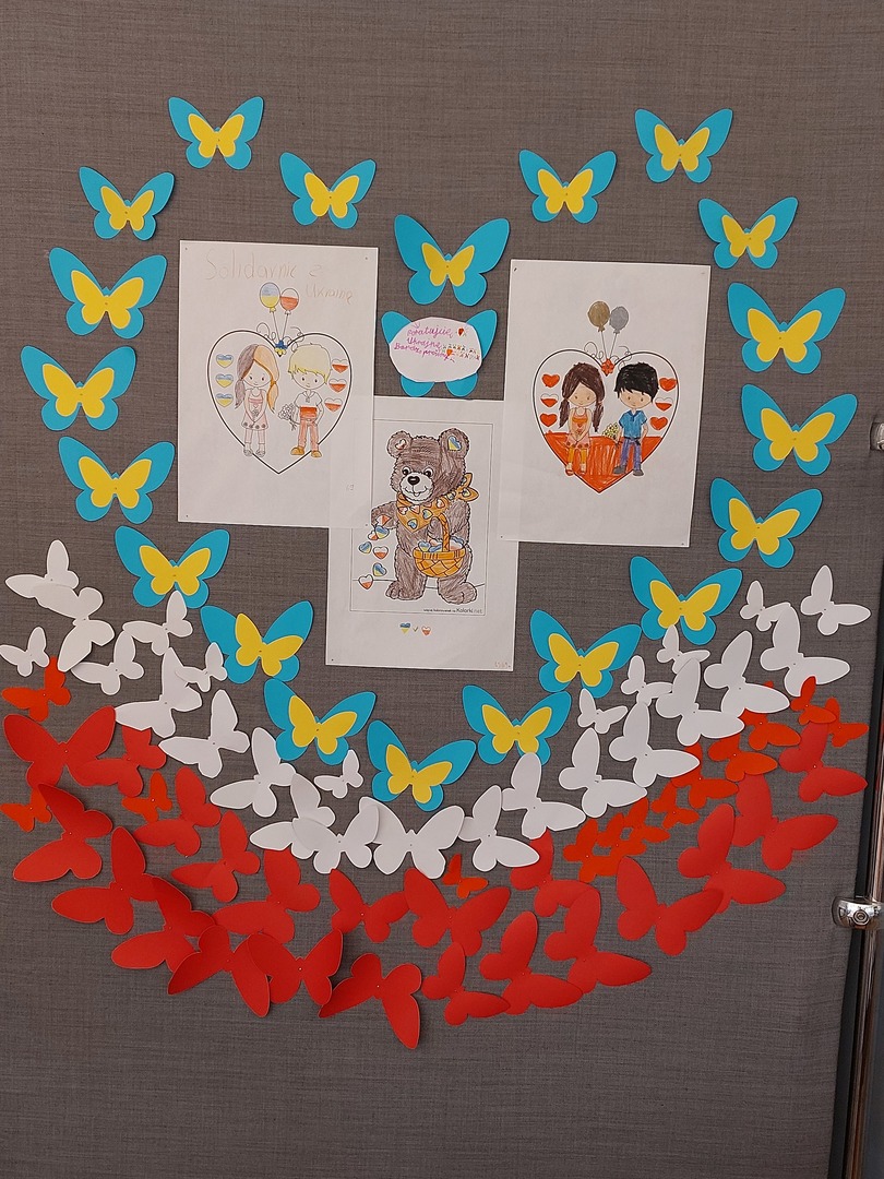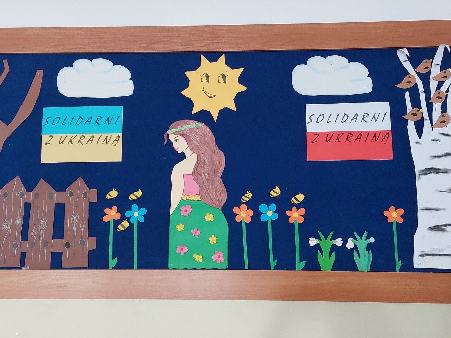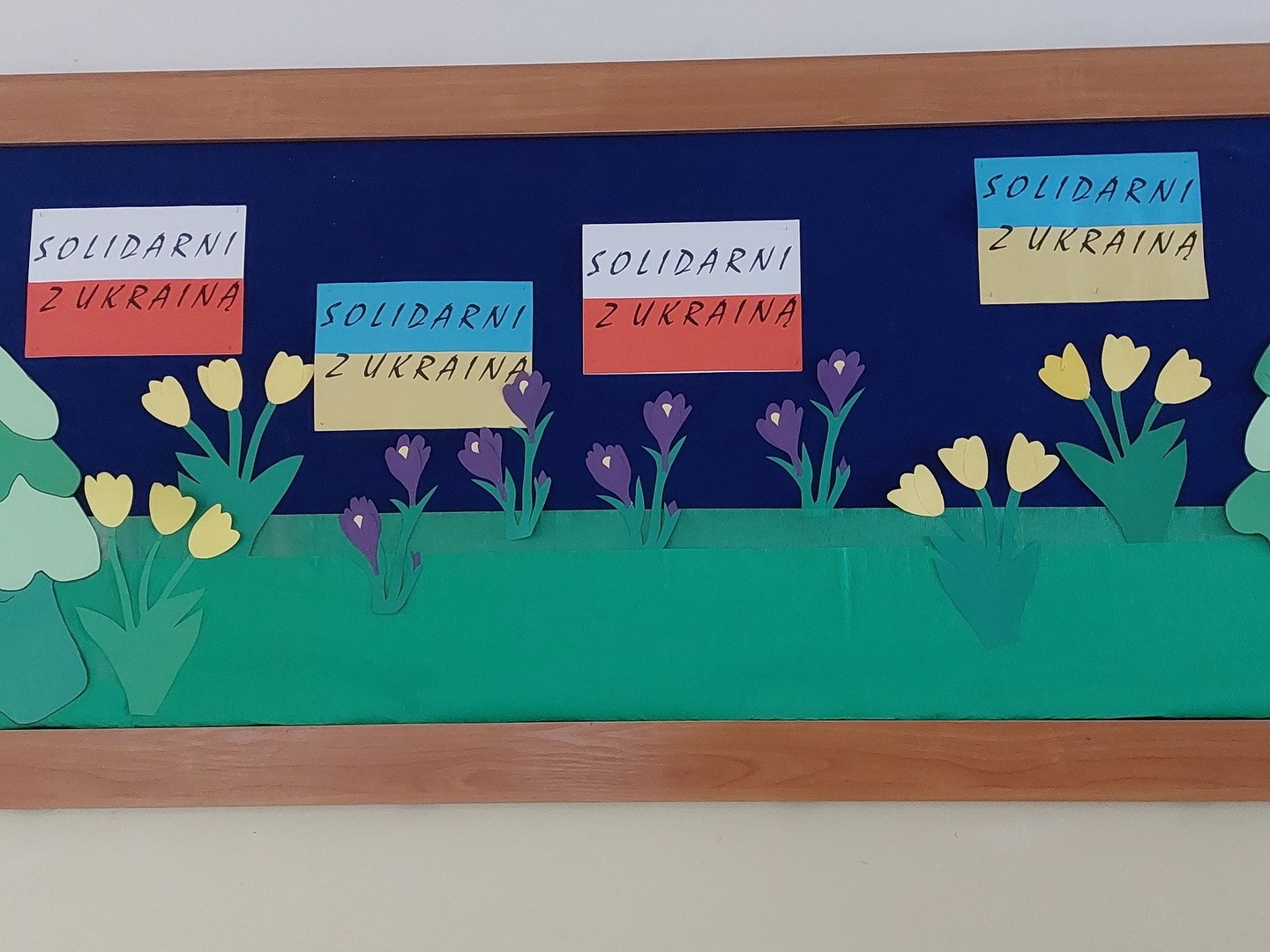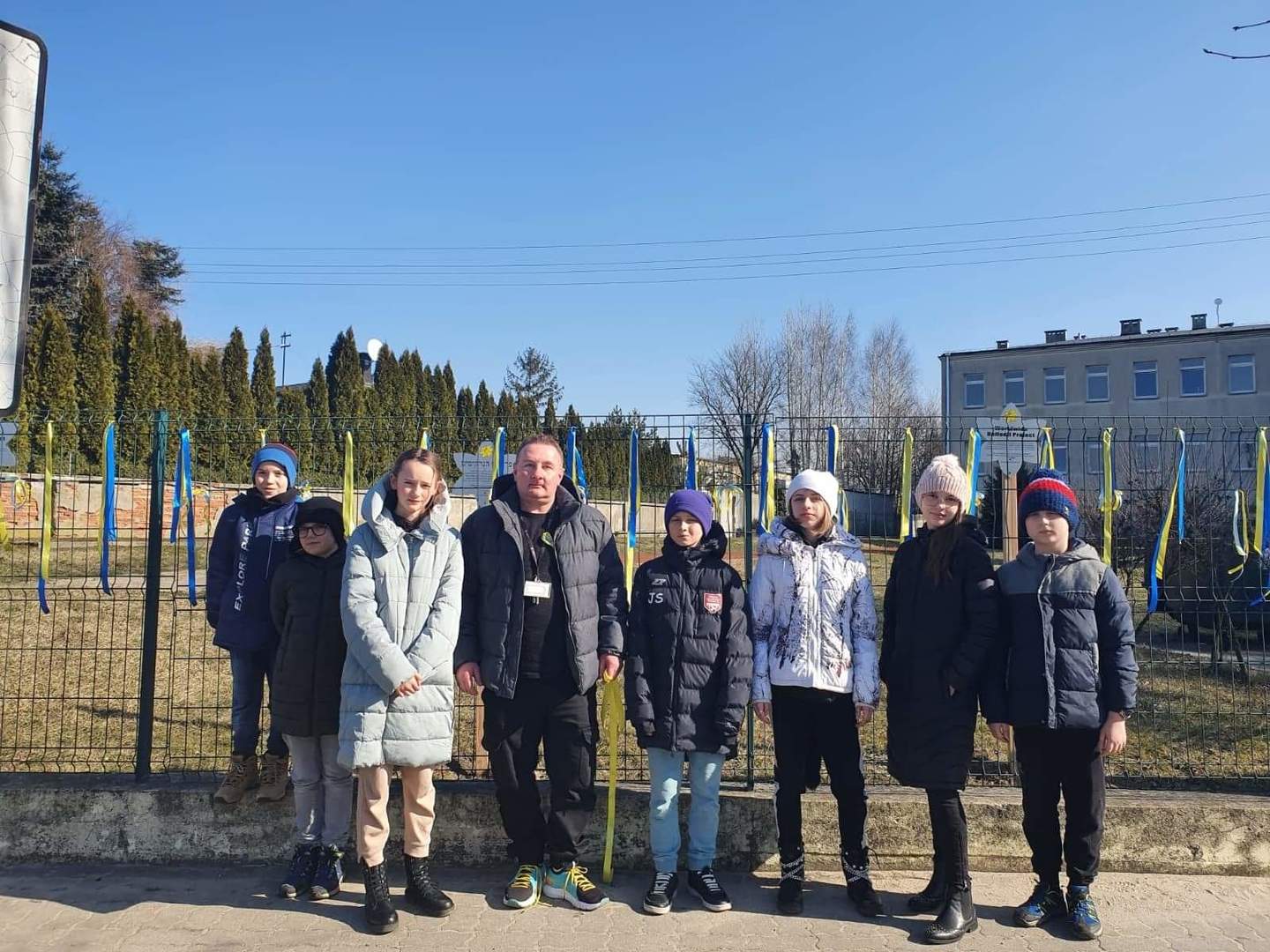 Następnie Pani Dyrektor ogłosiła, iż dzień 1 marca 2022 r będzie „DNIEM SOLIDARNOŚCI Z UKRAINĄ”. Zamiast tradycyjnych Ostatków cała społeczność szkolna przyczepiła do ubrań kotyliony, bądź kokardki w kolorach flagi naszego sąsiada. Niektórzy uczniowie ubrali się w barwy żółto-niebieskie. Przed budynkiem szkoły w miejscu upamiętnienia dzieci, które zginęły podczas Holokaustu i giną w obecnych konfliktach zbrojnych, na znak poległych wśród tysięcy ofiar dzieci ukraińskich zawieszono błękitno – żółte kokardki. Kolor błękitny, nawiązujący do barwy nieba, interpretuje się jako symbol pokoju, a żółty - kolor zboża, jako symbol bogactwa ziemi ukraińskiej.
