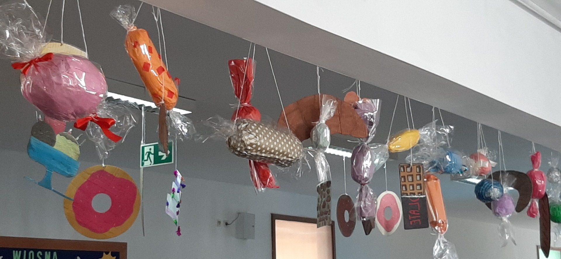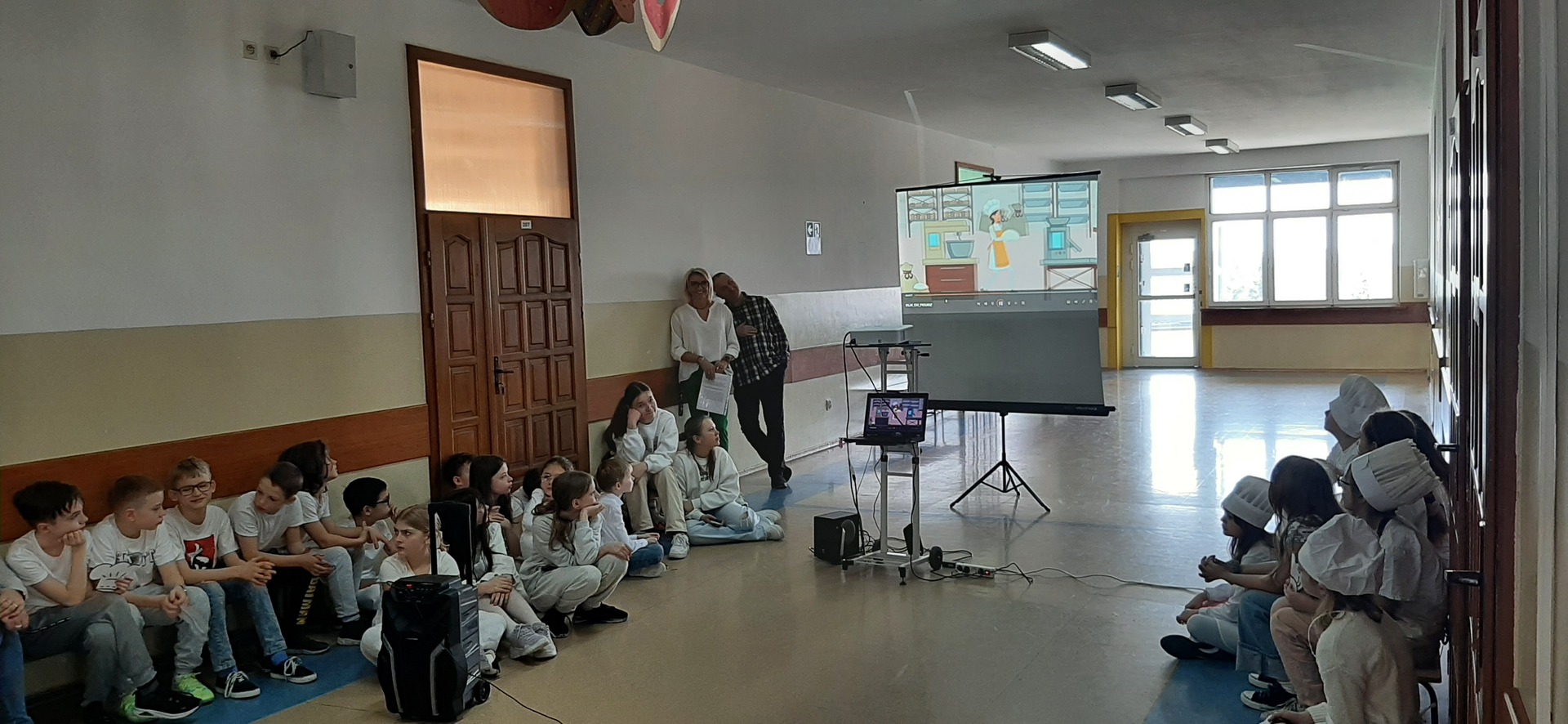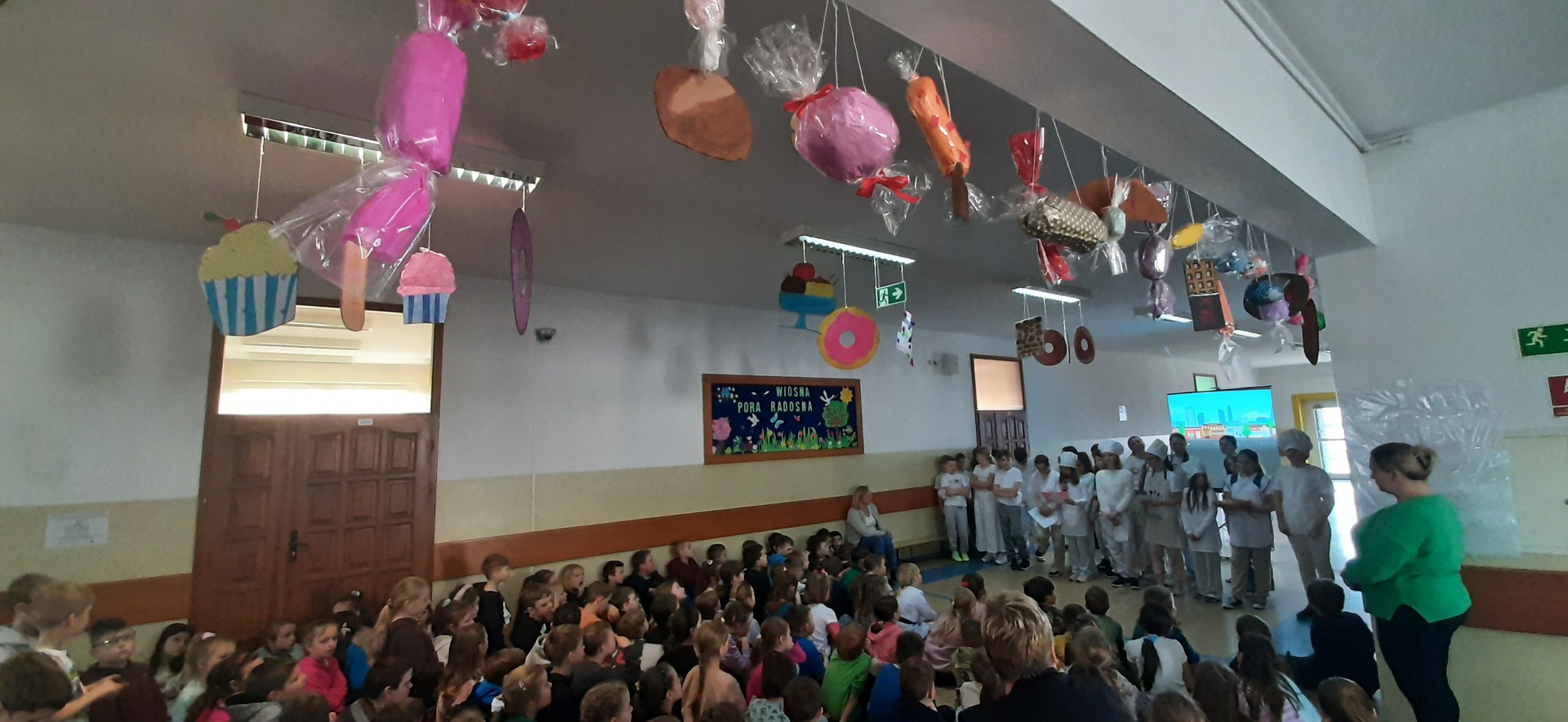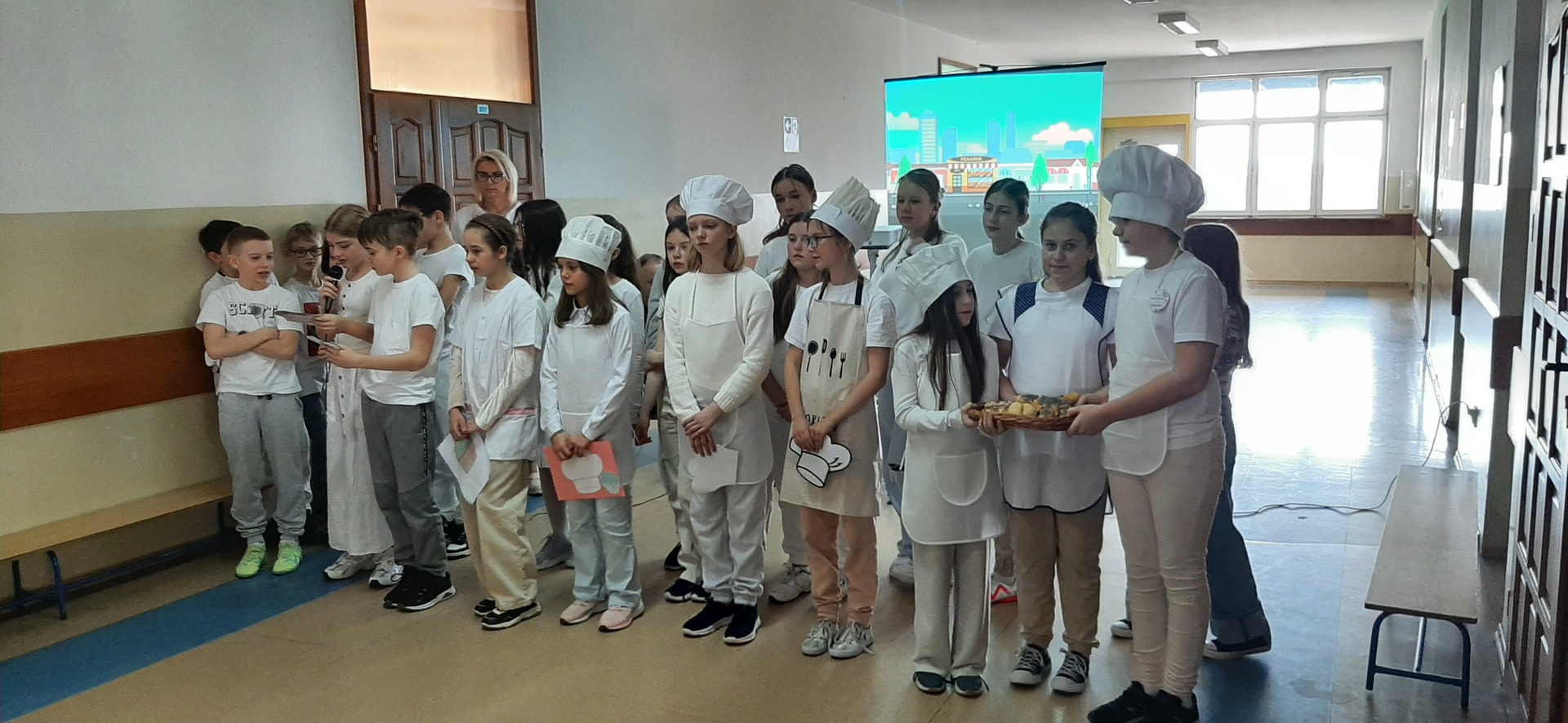 Społeczność uczniowska obejrzała filmy edukacyjne prezentujące pracę piekarza i cukiernika oraz wysłuchała piosenki w wykonaniu uczniów klasy 5a przygotowaną pod batutą pana Mariusza Kotarskiego.