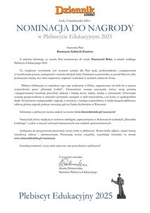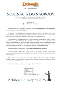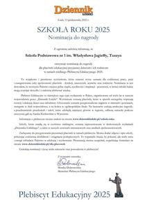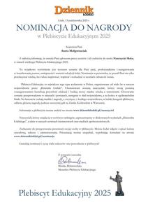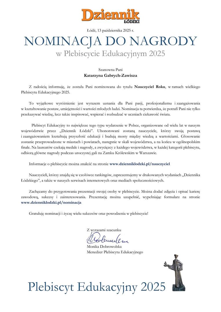 Jest nam niezmiernie miło poinformować o otrzymaniu nominacji do nagrody na najlepszą szkołę w województwie łódzkim. Praca i zaangażowanie naszej pani Dyrektor- Joanny Owczarek- Szymajdy zostały docenione. Walczy o tytuł najlepszego Dyrektora w województwie łódzkim. To bardzo cenne wyróżnienie, bo uświadamia, że szkoła to nie tylko miejsce nauki, ale i miejsce do którego chce się wracać, spędzać czas, zawierać przyjaźnie. Dyrektor jest tym, kto pozwala każdemu na indywidualny rozwój, otacza opieką i radą. A to fundamenty do bycia wspaniałym dorosłym.
