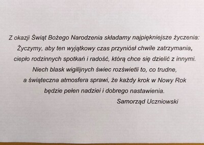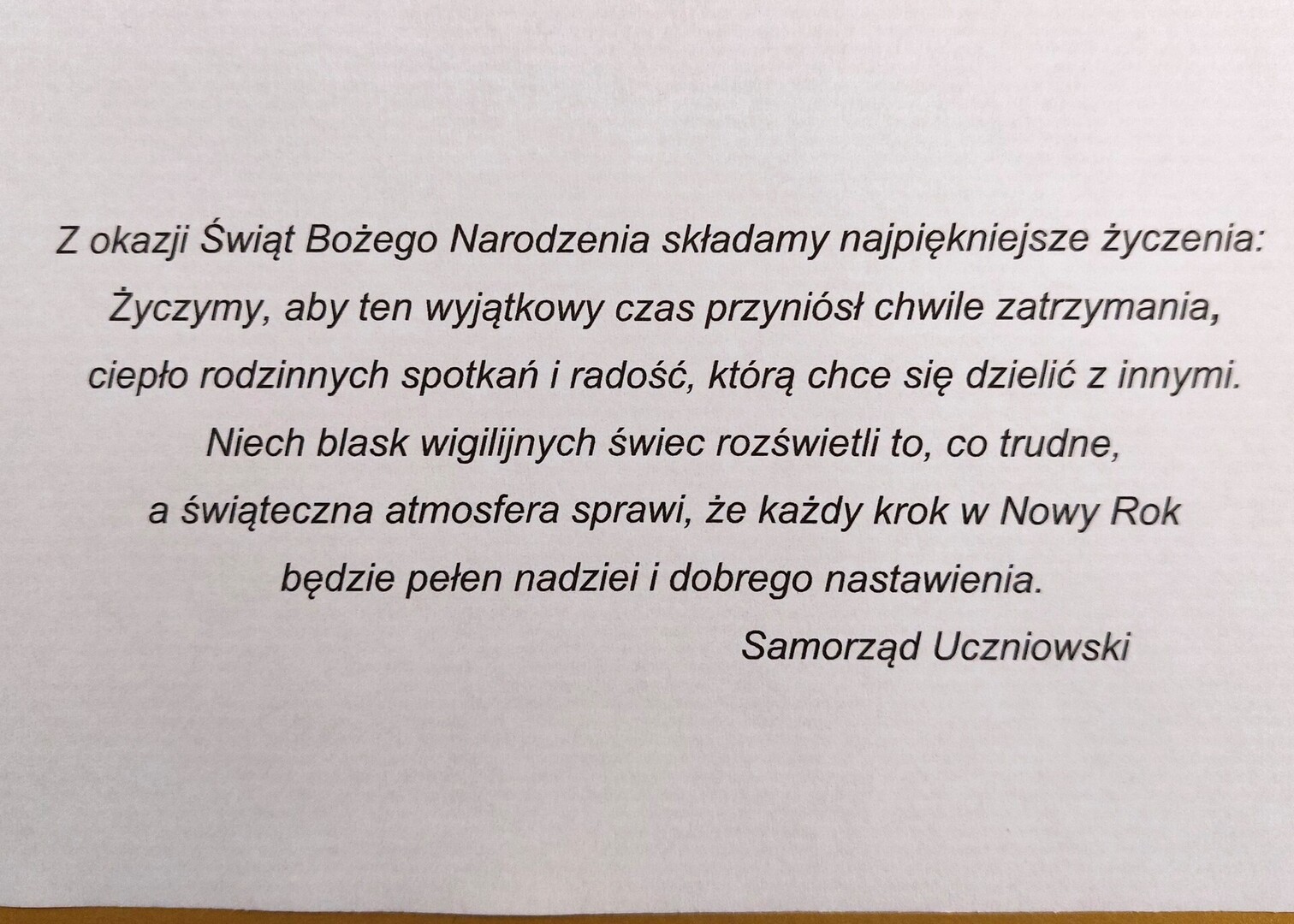 W naszej szkole czuć już świąteczną atmosferę. W ramach przygotowań do nadchodzących Świąt Bożego Narodzenia uczniowie z Samorządu Uczniowskiego wręczyli kartki świąteczne gronu pedagogicznemu oraz wszystkim pracownikom szkoły.